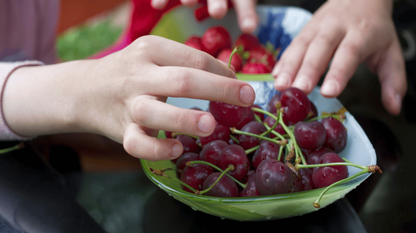 Eine Handvoll Kirschen in eine Schüssel, die bis zum Rand mit kaltem Wasser gefüllt ist, legen und los geht's: Ein Kind nach dem anderen versucht nun, ohne Hilfe der Hände eine Kirsche aus der
