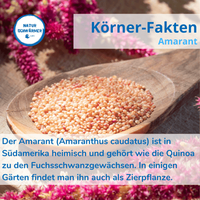 Amaranth. Aber auch Leinsamen, Sonnenblumenkerne, Kürbiskerne sind beliebte und wichtige Körner-Lieferanten.