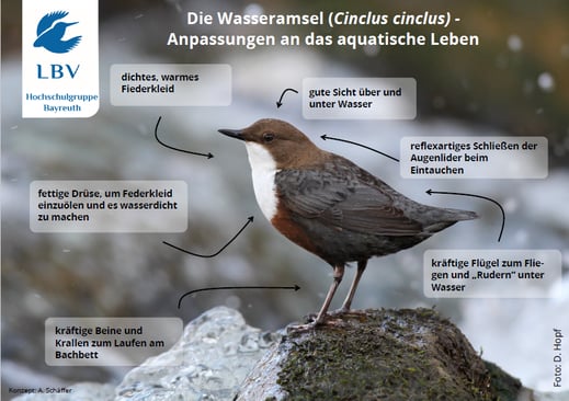 dem Gewässer fischt. Die Wasseramsel lebt gerne an kleinen Flüssen und Bächen mit viel Geröll, die durch den Wald fließen. Allerdings brütet sie nicht im Wasser,