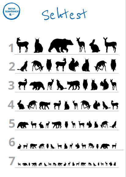 Sehvermögen überprüfen. Druckt dafür den Sehtest aus und befestigt ihn in drei Metern Entfernung an der Wand. Dann zählt ihr, wie viele Rehe sich in den einzelnen Reihen befinden. Könnt ihr auch