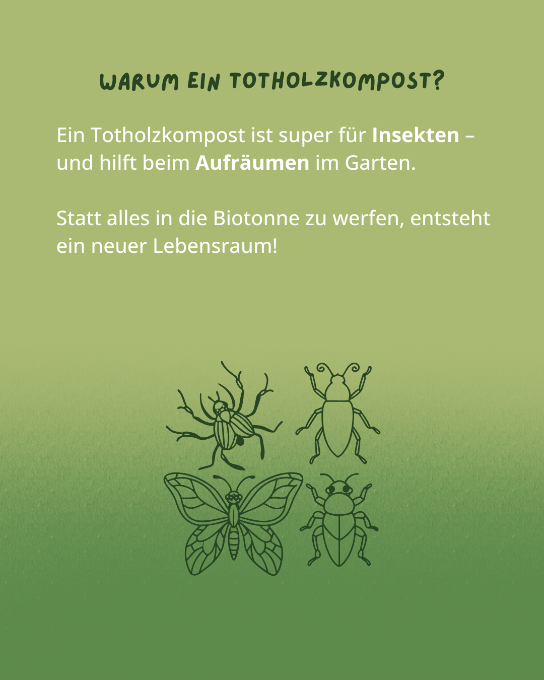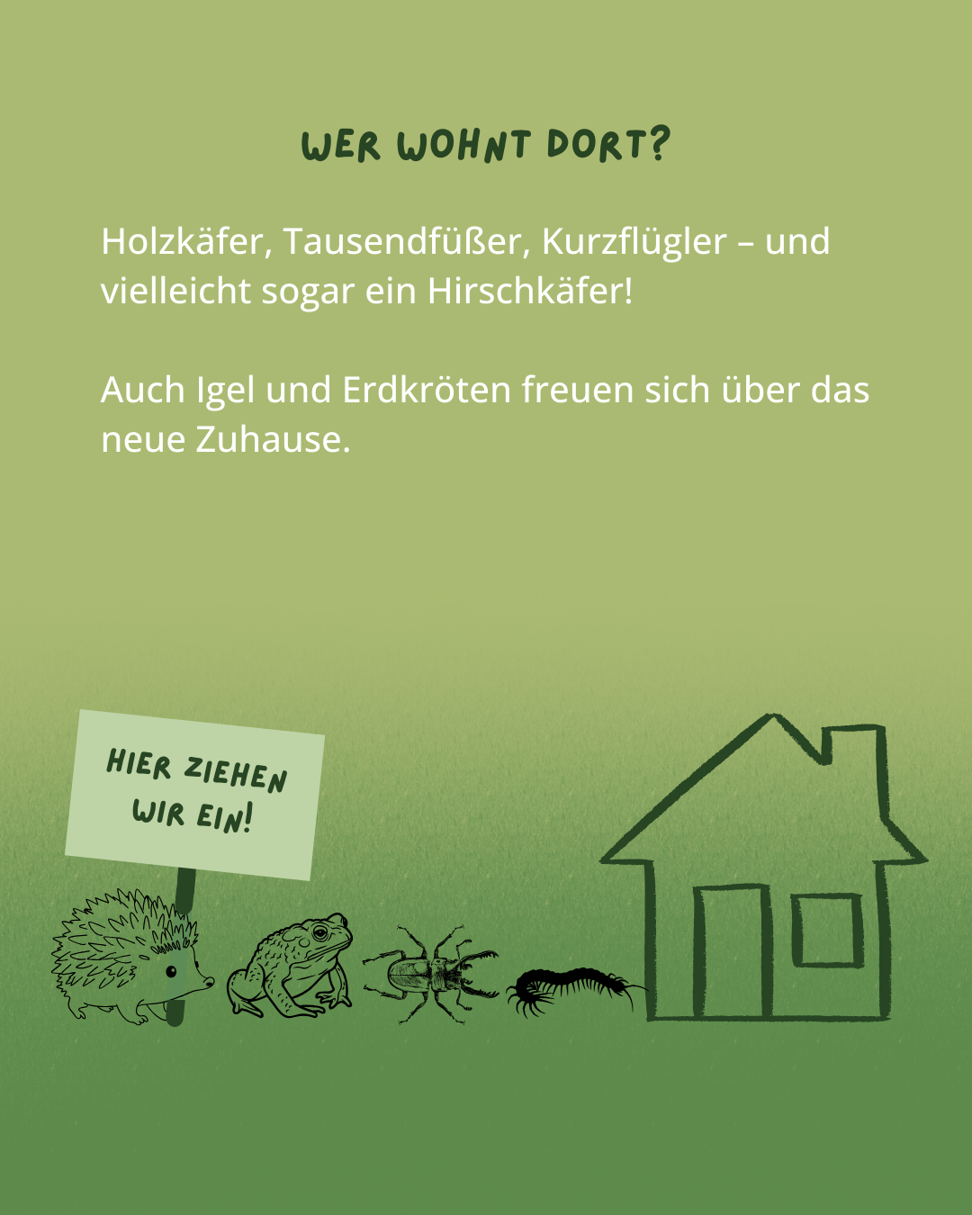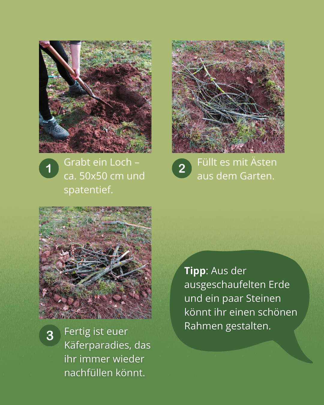 den Totholzkompost immer wieder mit Holzresten auffüllen. Euer neu geschaffenes Käferparadies wird bald von zahlreichen Insekten wie Holzkäfern, Tausendfüßern und Kurzflüglern als