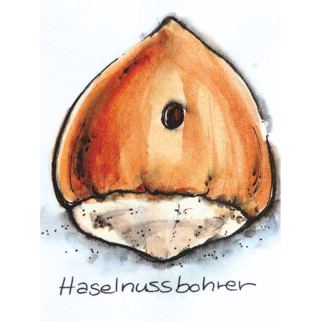 Haselnussbohrers in einer Nuss. In Hecken und Gärten gibt es unzählige solcher Hinweise.