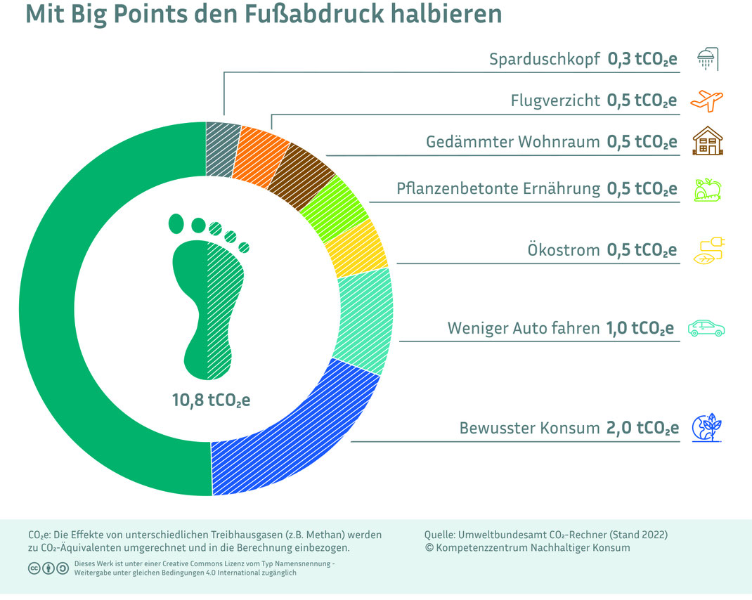 Big Points sind die entscheidenden Hebel im Alltag, mit denen wir besonders viel fürs Klima tun können. Statt sich in vielen kleinen Maßnahmen zu verlieren, lohnt es sich, auf diese großen Stellschrauben zu setzen. Laut Umweltbundesamt lassen sich durch die Big Points bis zu 50 % des persönlichen CO₂-Ausstoßes einsparen. Wer noch mehr über die Big Points erfahren möchte, sollte sich auf der Website des Kompetenzzentrums Nachhaltiger Konsum umschauen.