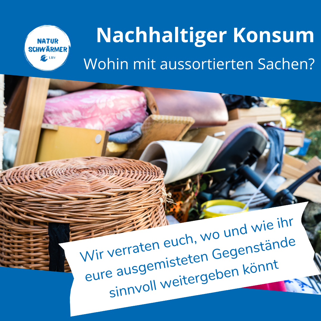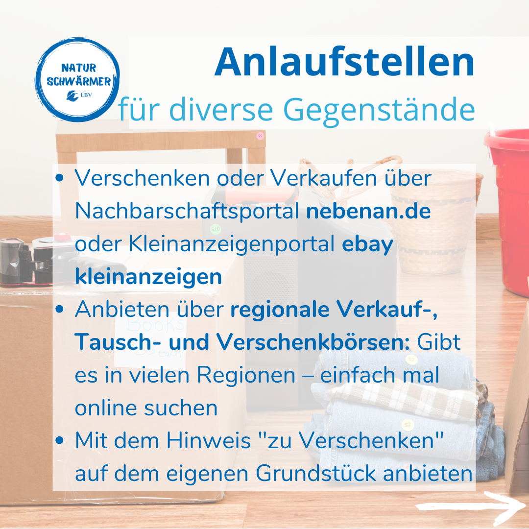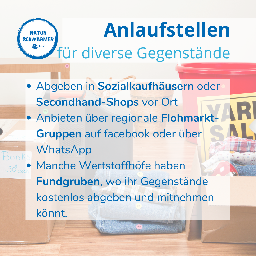 Bevor wir uns etwas Neues zulegen, sollten wir schon Vorhandenes unter die Lupe nehmen und nutzen, was wir bereits haben. Kommen wir jedoch zu dem Schluss, dass wir etwas nicht mehr brauchen, gibt es viele andere Möglichkeiten, es sinnvoll weiter zu verwenden als den Weg in die Tonne. Gerade zu Jahresbeginn haben bestimmt viele von euch zuhause mal wieder so richtig ausgemistet. Kein Wunder, denn Ausmisten kann sich so richtig befreiend anfühlen. Und je nachdem, was für einen Lebensstil man hat, wie oft man vorher schon ausgemistet hat oder wie viele Leute mit unterschiedlichen Interessen im Haushalt wohnen, kann dabei sehr viel Material anfallen. Vieles davon sollten wir nicht wegwerfen, da es noch „zu gut für die Tonne“ ist und andere noch glücklich machen kann. Das befreiende Gefühl erhält dann vielleicht einen kurzen Dämpfer, wenn wir vor unserem Haufen aussortierter Sachen stehen und einfach nicht wissen, wohin wir sie sinnvoll geben können. In den Slides geben wir euch einen Überblick über von uns Naturschwärmern zusammengetragene Anlaufstellen, die sich für uns bewährt haben.