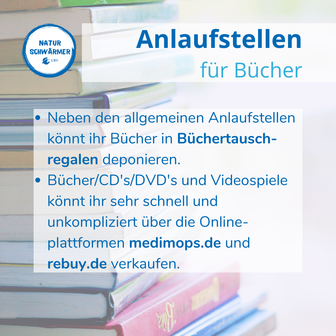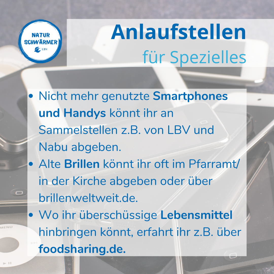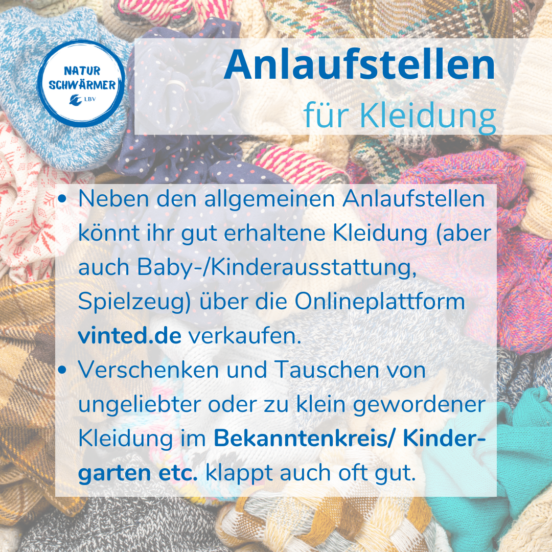 Bevor wir uns etwas Neues zulegen, sollten wir schon Vorhandenes unter die Lupe nehmen und nutzen, was wir bereits haben. Kommen wir jedoch zu dem Schluss, dass wir etwas nicht mehr brauchen, gibt es viele andere Möglichkeiten, es sinnvoll weiter zu verwenden als den Weg in die Tonne. Gerade zu Jahresbeginn haben bestimmt viele von euch zuhause mal wieder so richtig ausgemistet. Kein Wunder, denn Ausmisten kann sich so richtig befreiend anfühlen. Und je nachdem, was für einen Lebensstil man hat, wie oft man vorher schon ausgemistet hat oder wie viele Leute mit unterschiedlichen Interessen im Haushalt wohnen, kann dabei sehr viel Material anfallen. Vieles davon sollten wir nicht wegwerfen, da es noch „zu gut für die Tonne“ ist und andere noch glücklich machen kann. Das befreiende Gefühl erhält dann vielleicht einen kurzen Dämpfer, wenn wir vor unserem Haufen aussortierter Sachen stehen und einfach nicht wissen, wohin wir sie sinnvoll geben können. In den Slides geben wir euch einen Überblick über von uns Naturschwärmern zusammengetragene Anlaufstellen, die sich für uns bewährt haben.