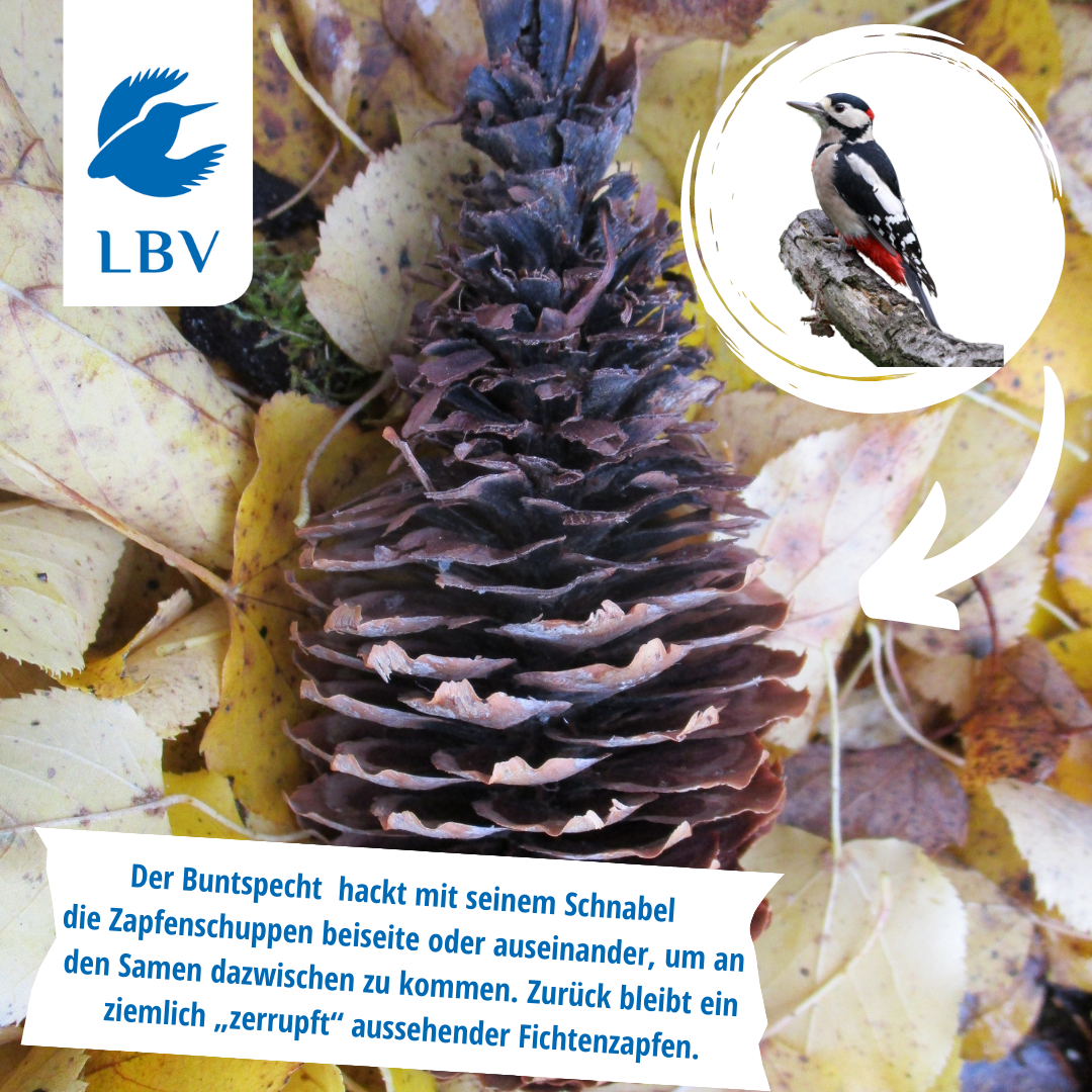 - Buntspecht: Hackt die Schuppen mit seinem Schnabel beiseite. Der Zapfen sieht danach ziemlich „zerrupft“ aus.