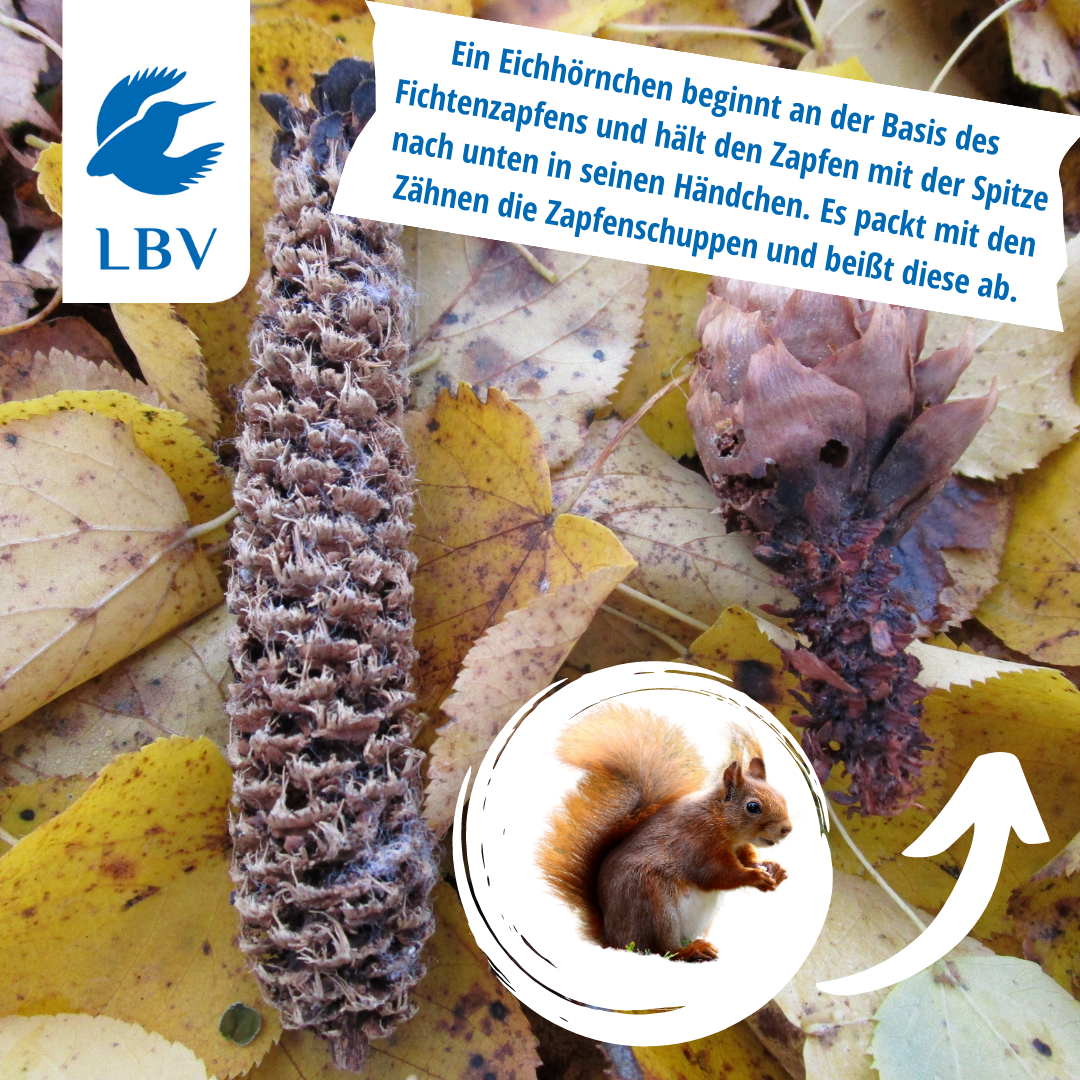Wenn ihr draußen unterwegs seid, schaut euch mal genau um: An Fichten, Kiefern oder Sträuchern wie Hasel könnt ihr angeknabberte Zapfen oder Nüsse entdecken. Wer war hier wohl am Werk?