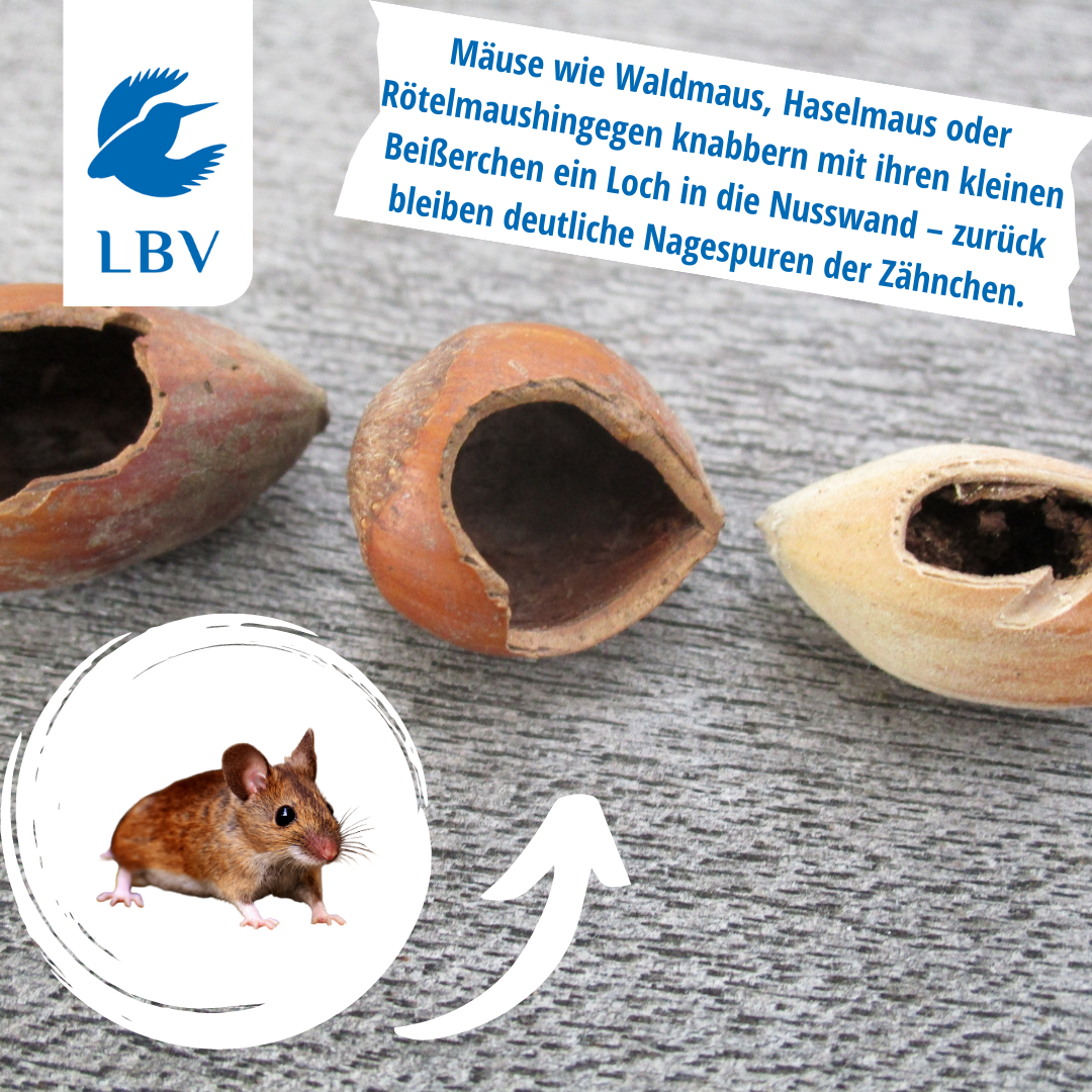 Mäuse wie Waldmaus oder Haselmaus nagen mit ihren kleinen Zähnchen ein Loch in die Schale. Zurück bleiben deutliche Nagespuren rund um das Loch.