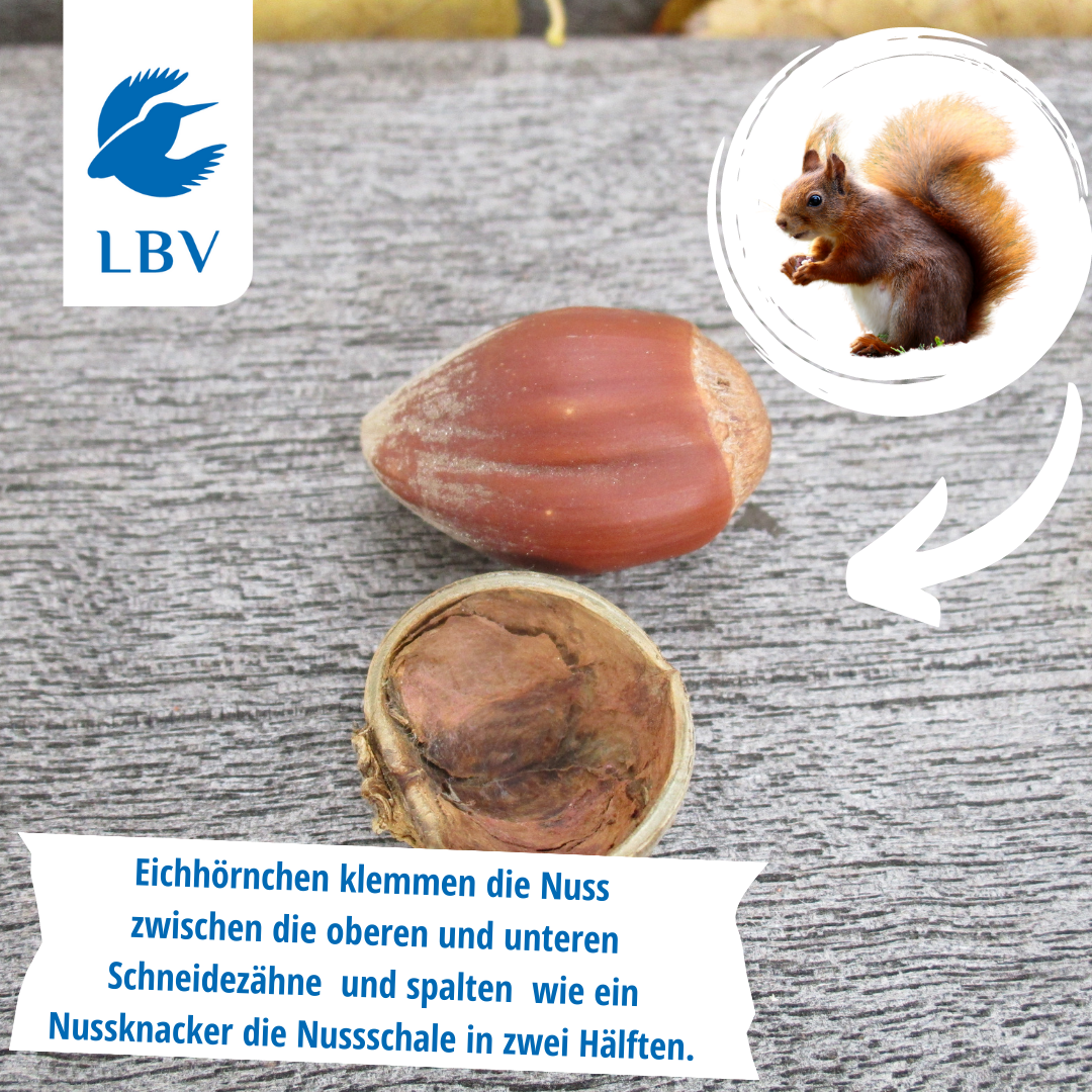 Eichhörnchen knacken Nüsse wie Profis! Sie klemmen die Nuss zwischen ihre Schneidezähne und spalten die Schale in zwei Hälften. Typisch sind Bruchkanten, nicht feine Nagespuren.