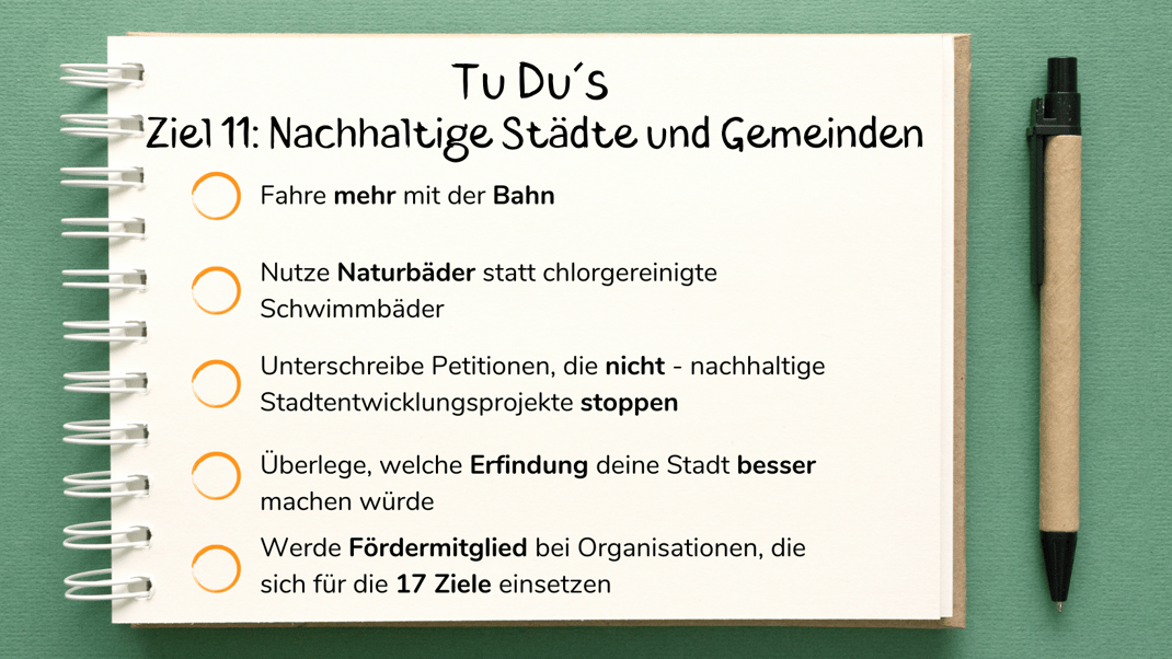 Die Städte und Siedlungen sollen inklusiv, sicher, widerstandsfähig und nachhaltig gestaltet sein.