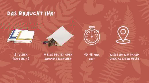 Vorbereitung: Die Spielleitung sammelt vor dem Start 10 bis 12 verschiedene Naturmaterialien aus der Umgebung – zum Beispiel Blätter, Früchte, Zapfen, Rindenstücke,